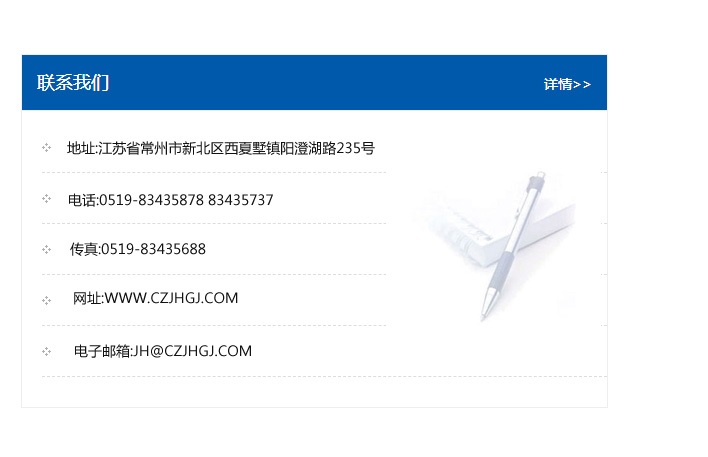 地址:常州市新北區友邦商務大廈1幢16、17層  電話:0519-85101652  傳真:0519-85112595  郵編:213022  網址:www.cz-jiayue_cn.lyhggs.com  郵箱:xiajifengaa@163.com